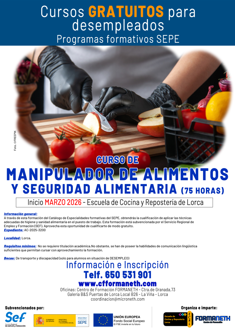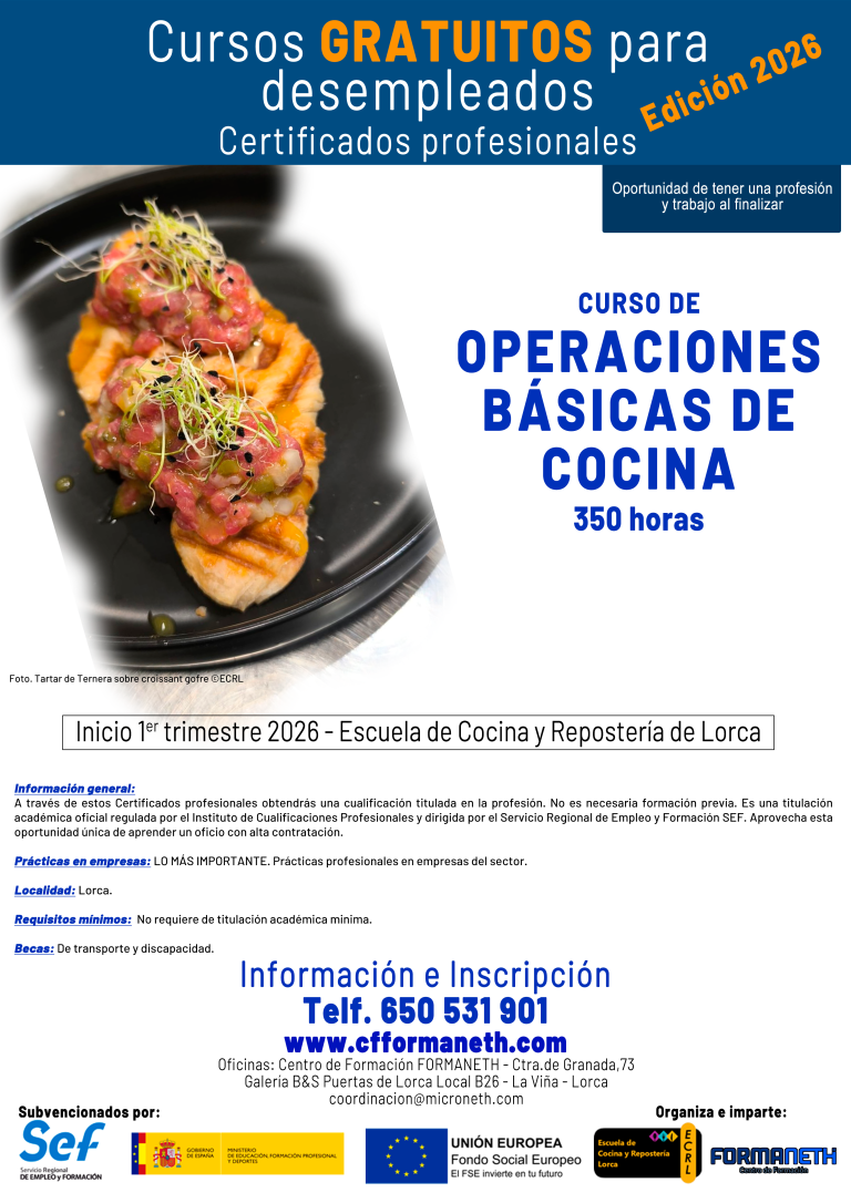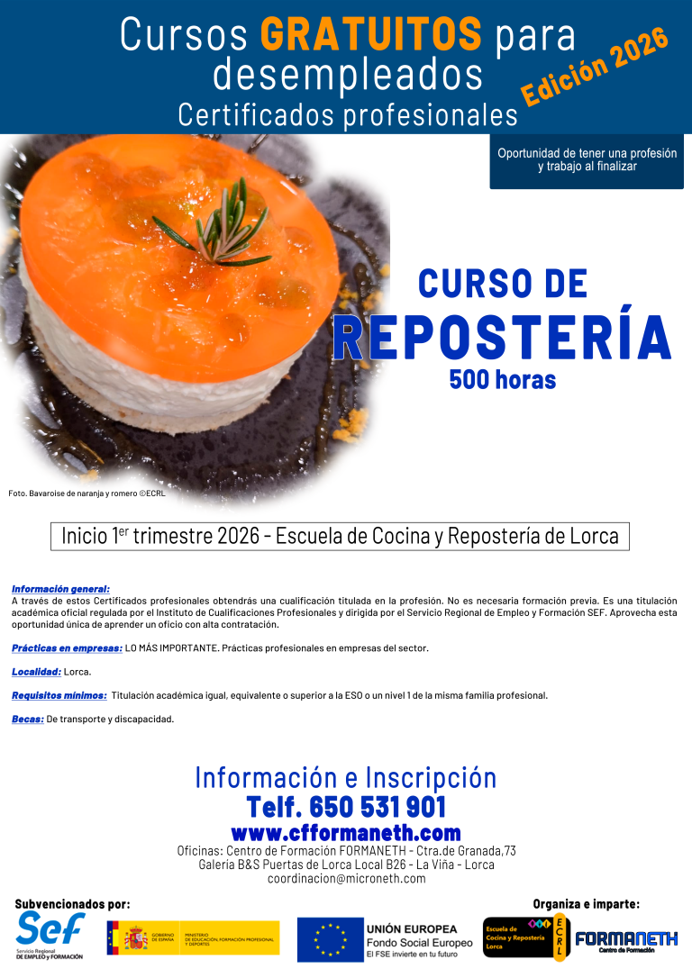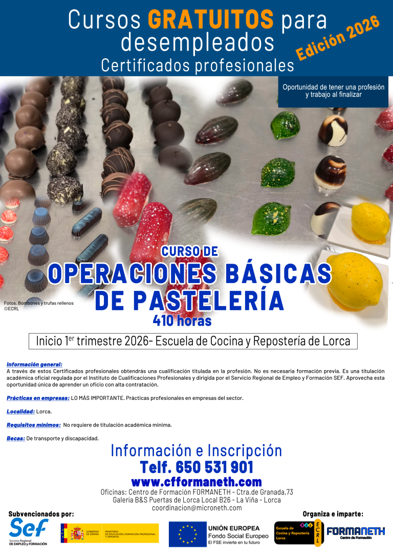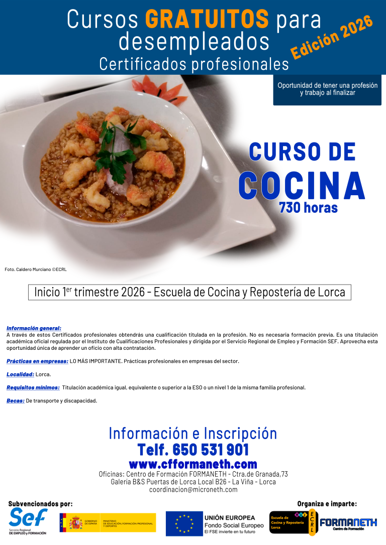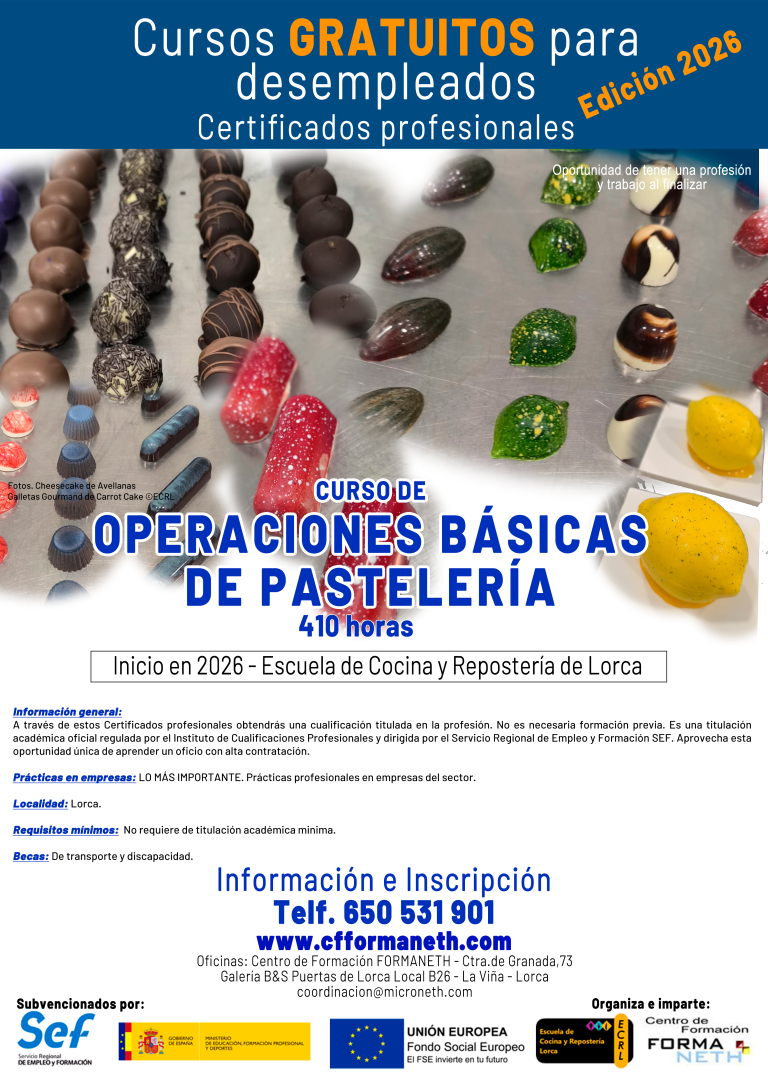 La Escuela de Cocina y Repostería de Lorca, está situada en la Galería de oficinas Puertas de Lorca. Tiene entrada directa por la C/ Infante Juan Manuel.